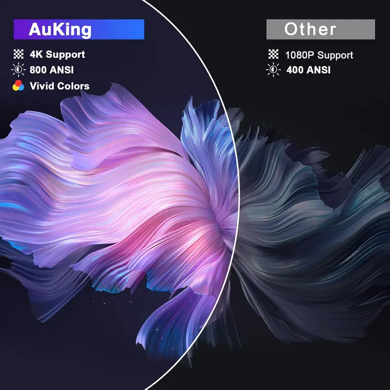 [800ANSI & 4K Support, Detail-first Visual Feast]This 4K projector features 800 ANSI lumens and supports 4K input, ensuring crystal-clear images with stunning detail. With advanced LCD Pro and color reproduction technology, AuKing video projector is at least 98% brighter and clearer than other 1080P projectors, delivering natural light and dark filtering along with sharp contrast, enhancing realism and vividness in every scene