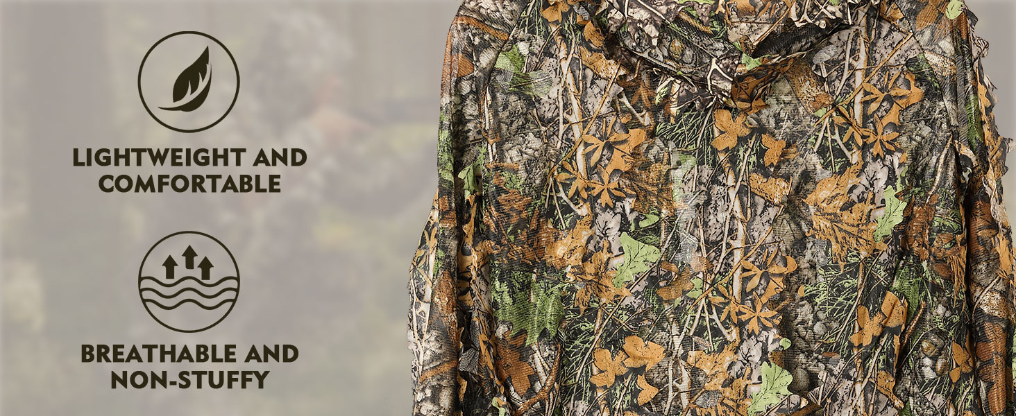 Breathable Comfortable Camo Fabrics - The ghillie suit is made from synthetic polyester, breathable and comfortable. Lightweight mesh fabric makes you feel light and easy to dry when you wear it. The material is shredded along the edges of the 3D part for good protection and camouflage, Good choice for hunting, airsoft paintball, etc outdoor games.