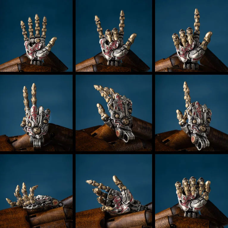Structural Composition: The entire robotic hand is hand-assembled from 28 individual brass components (mainly brass, with decorative accents of white copper). Each finger has three joints connected by micro-brass pins.